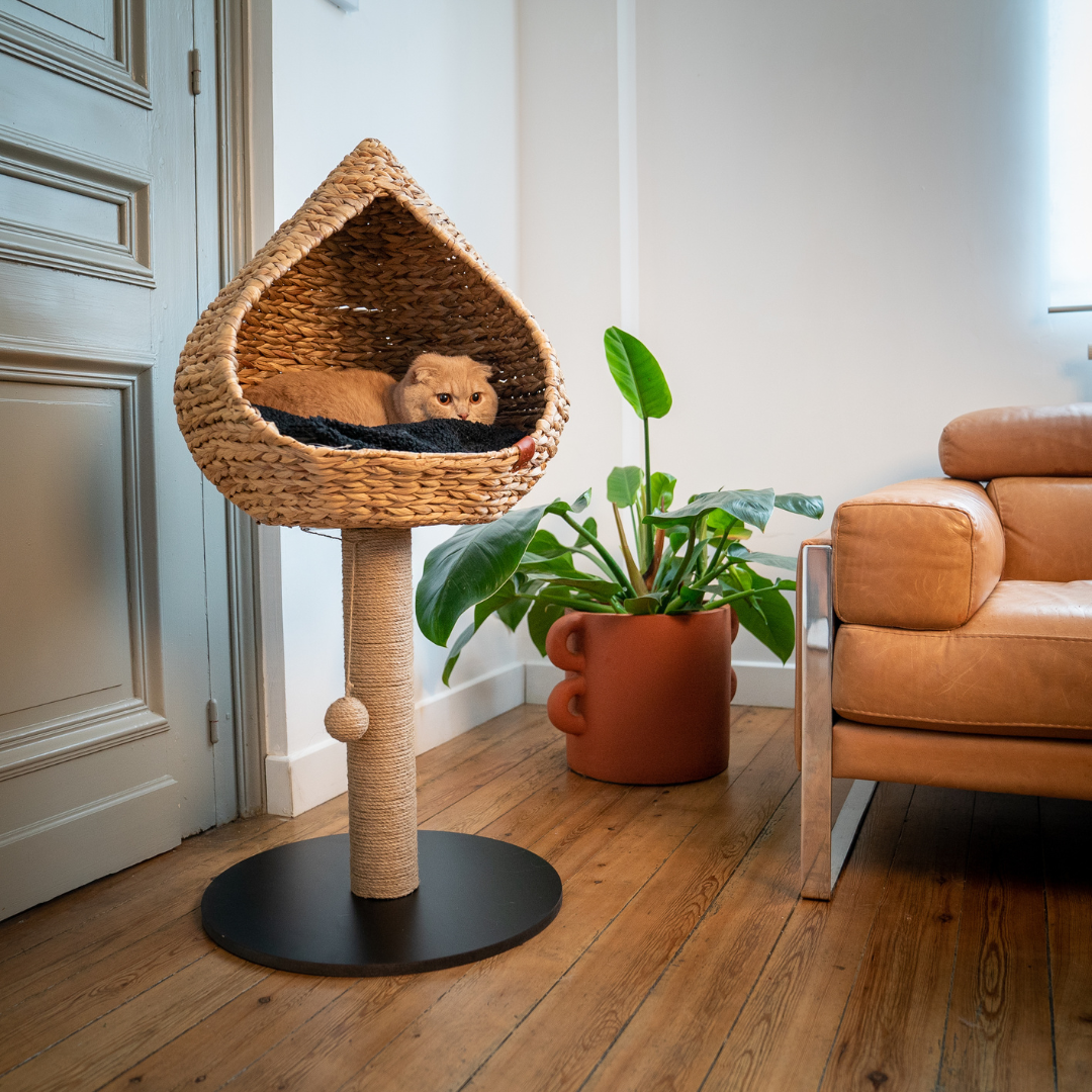 L'arbre à chat goutte sera particulièrement bien situé dans l'angle d'une pièce de vie : votre chat pourra y faire ses griffes, mais aussi passer du temps près de vous, tout en sécurité.